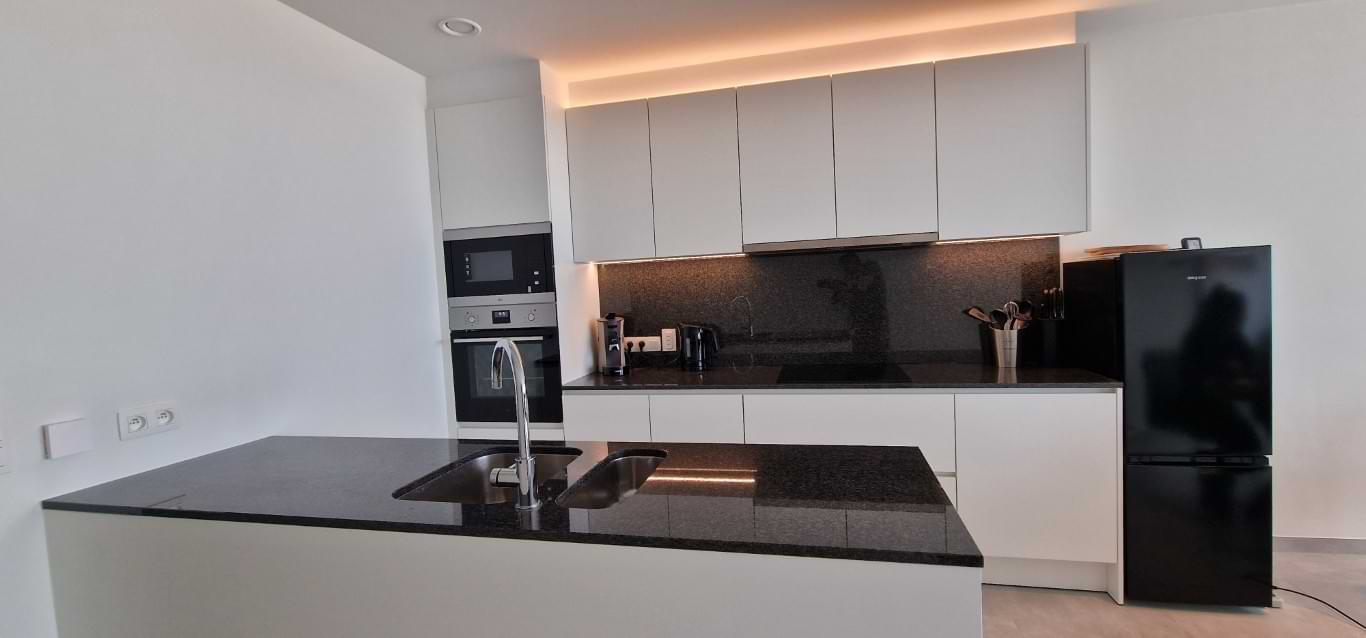 - Moderne keuken met inductie fornuis, vaatwasser, grote koelkast met afzonderlijk ruim vriesvak, oven en microgolfoven.